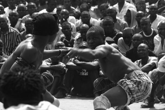 Dambe is a popular martial art of the Hausa tribe from Northern Nigeria. Similar to boxing, Dambe fighters win by knocking opponents down with punches or kicks. It was historically practised by Hausa butchers around harvest or festival time and was considered a test of bravery.
